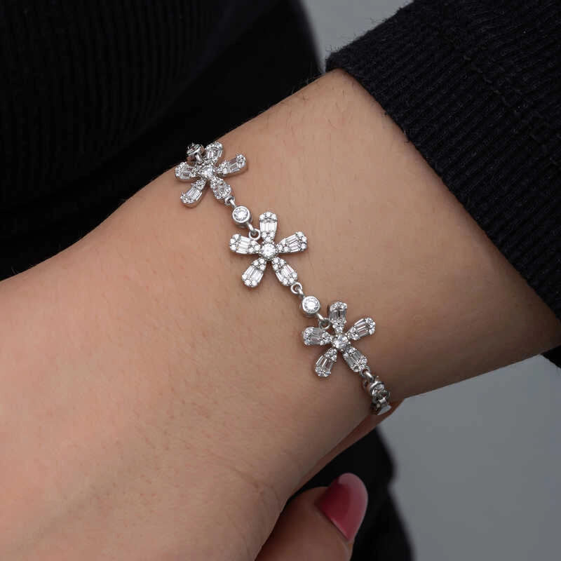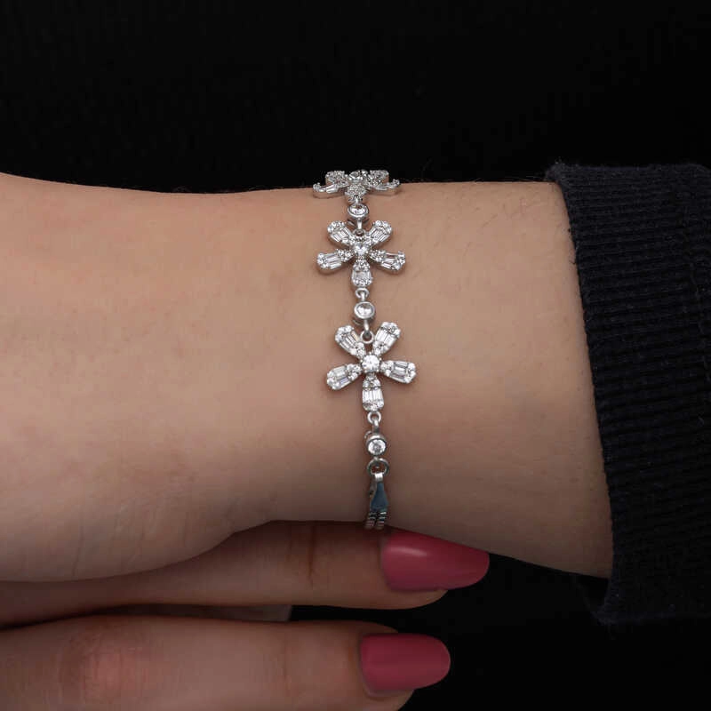 925 Ayar Gümüş Baget Çiçek Desenli Kadın Bileklik