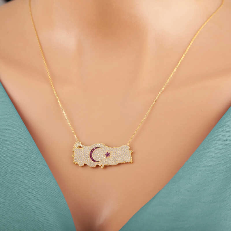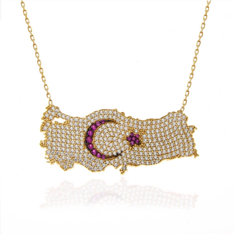 925 Ayar Gümüş Gold Ay Yıldız Türkiye Haritası Kadın Kolye