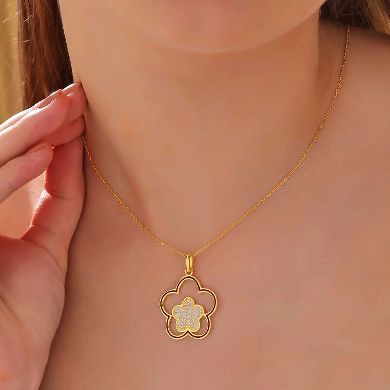 925 Ayar Gümüş Gold Çiçek Desenli Kadın Kolye