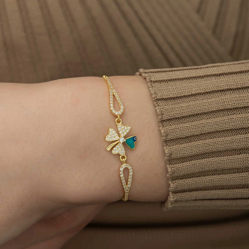 925 Ayar Gümüş Gold Nazarlı Yonca Bileklik