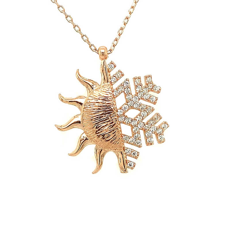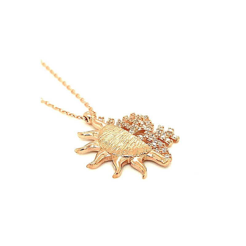 Güneş; ışığın, bilginin, iyiliğin, gücün ve yönetimin sembolüdür. Bu ışıl ışıl ve farklı tasarımıyla göz kamaştıran kolye; 925 ayar gümüşten imal edilmiştir. Gümüş üzerine rose kaplama yapılmıştır. Rose kaplama yapılan gümüş ürünler parlaklığını uzun süre muhafaza eder, oksitlenmesi gecikir. Gümüş güneş kartanesi bayan kolye üzerinde bulunan taşlar zirkon'dur. Tüm gümüş kolyelerde olduğu gibi gümüş güneş bayan kolye de tamamı el emeği ile üretilmiştir. Gümüş ve değerli taşlar nedeniyle belirtilen ortalama ürün ağırlığında ± %10 sapma olabilmektedir.