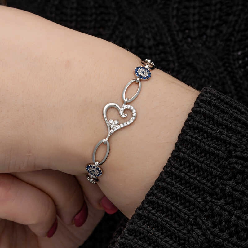 925 Ayar Gümüş Kalpli Nazar Kadın Bileklik