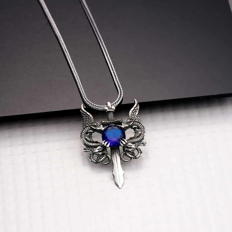 925 Ayar Gümüş Mavi Taşlı Ejderha Erkek Kılıç Kolye
