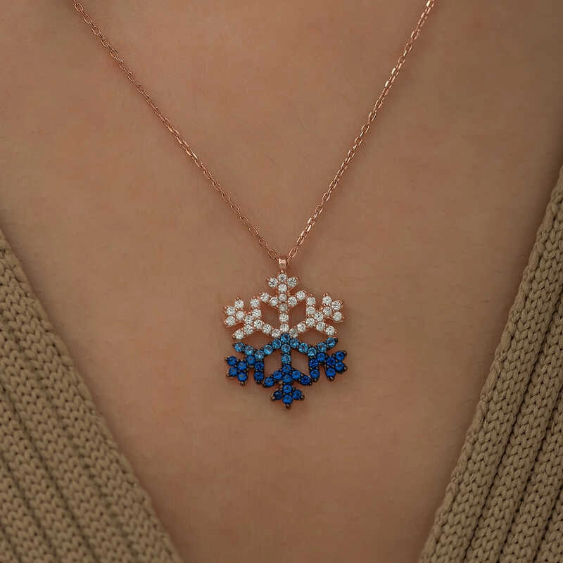 Kadınların ışıltısı, berraklığı kar tanesine benzetilip özel olarak tasarlanmıştır. Kar tanelerinin her birinin kadınlar gibi eşsiz ve ayrı kıymette olması onları özel kılan bir diğer özelliktir. Asilliği her dönemde dikkat çekmeyi başarmıştır. Bunun yanında insanların tıpkı kar taneleri gibi birbirlerine zarar vermeden de mutlu bir şekilde yaşayabileceklerini sembolize etmektedir. Bu şık kolye; doğum günü hediyesi, sevgililer günü hediyesi veya annelere hediye olarak özel günlerde tercih edilebilecek mükemmel bir seçenektir. Kolye, 925 ayar gümüşten imal edilmiştir. Gümüş üzerine rose kaplama yapılmıştır. Rose kaplama yapılan ürünler parlaklığını uzun süre muhafaza eder ve oksitlenmesi gecikir. Tüm gümüş kolyelerde olduğu gibi bu gümüş mavi taşlı kar tanesi kolye de tamamı el emeği ile üretilmiştir. Gümüş ve değerli taşlar nedeniyle belirtilen ortalama ürün ağırlığında ± %10 sapma olabilmektedir.