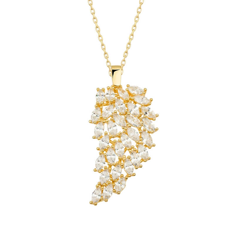 Zirkon taşlarla kaplı ışıl ışıl melek kanadı gümüş kolye ile kanatsız meleğinize tek eksiğini verip, onu sevindirebilirsiniz. "Benim sevgilim bir melek" diyorsanız, melek kanadı kolye tam da sevgilinize göre… Melek kanadı gümüş kolye, hayatınızın aşkı için uygun bir hediye olduğu kadar, anneniz ya da kız kardeşiniz için de son derece uygundur. Hayatınız da değer verdiğiniz mutlu etmek istediğiniz sevdiklerinizi meleklere layık bir hediye ile sevindirin. 925 ayar gümüşten imal edilmiştir. Gümüş üzerine gold kaplama yapılmıştır. Gold kaplama yapılan ürünler parlaklığını uzun süre muhafaza eder, oksitlenmesi gecikir. Gümüş melek kanadı bayan kolye üzerinde bulunan taşlar zirkondur. Tüm kolye modellerimizin tamamı el emeği ile üretilmiştir. Gümüş ve değerli taşlar nedeniyle belirtilen ortalama ürün ağırlığında ± %10 sapma olabilmektedir.