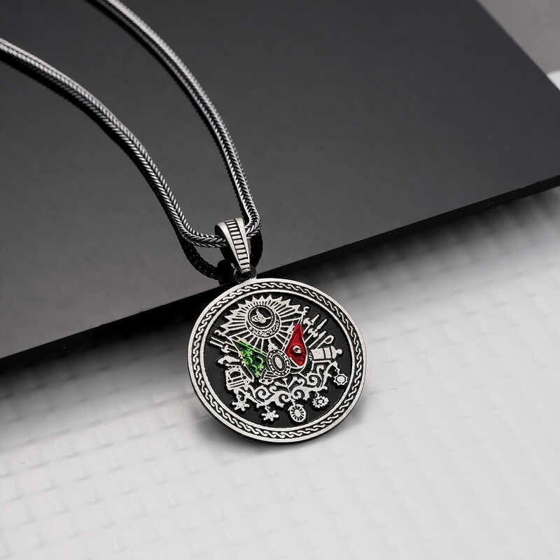Osmanlı İmparatorluğu Devlet Arması, 19. yüzyılda Osmanlı Devleti için hazırlanmıştır. Ondan önce, padişahların tuğraları devlet nişanı yerine geçiyordu. Osmanlı nişanının son halini 1882'de Sultan II. Abdülhamit tarafından yürürlüğe konmuştur. Osmanlı Devlet Nişanı'nın içinde iki tane bayrak vardır. Kırmızı zeminde ay-yıldız bulunan bayrak Osmanlı Hanedanı'nı, yeşil zemindeki bayrak İslam halifeliğini simgelemektedir. Terazi, Osmanlı adaletini, terazide bulunan kitaplar da adaletin kaynağı olan Osmanlı kanunnamelerini ve Kur'an-ı Kerim'i temsil etmektedir. Bu şık kolyeyi sevdiklerinize doğum günlerinde, özel günlerde veya babalar gününde hediye edebilir onları sevindirebilirsiniz. Bu özel tasarım erkek kolye 925 ayar gümüşten imal edilmiştir. Gümüş üzerine oksit kaplama yapılmıştır. Tüm gümüş erkek kolyelerinde olduğu gibi gümüş osmanlı armalı erkek kolye de el emeği ile üretilmiştir. Gümüş ve değerli taşlar nedeniyle belirtilen ürün ağırlığında ± %10 sapma olabilmektedir.