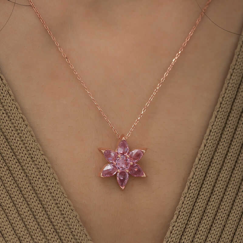 925 Ayar Gümüş Pembe Çiçek Kadın Gümüş Kolye