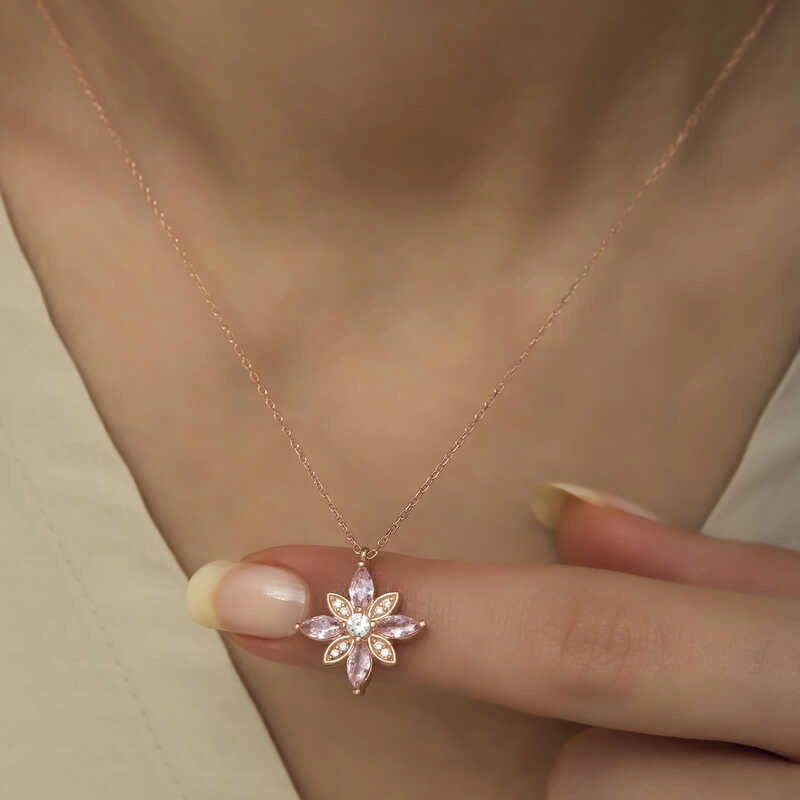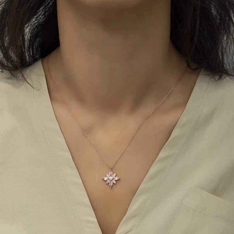 925 Ayar Gümüş Pembe Taşlı Umut Çiçeği Gümüş Kolye