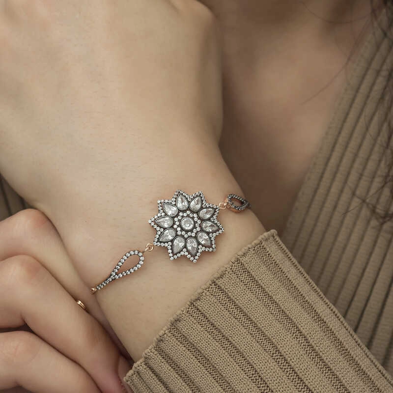 925 Ayar Gümüş Rose Çiçek Desenli Elmas Montür Bileklik