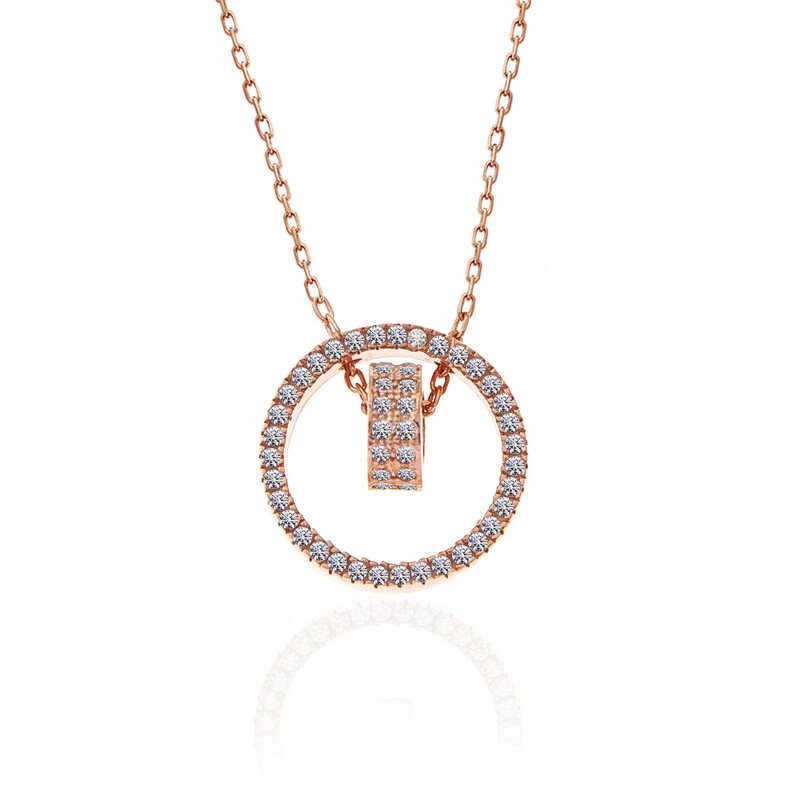 İçe içe geçmiş halka kadın kolye, sembollerden hoşlanmayıp sadelikten yana olanların tercih edebileceği oldukça şık bir tasarımdır. Gümüş iç içe geçmiş halka kadın kolye, son yıllarda oldukça popüler modeller arasındaki yerini almıştır. Gümüş iç içe geçmiş kadın kolye 925 ayar gümüşten imal edilmiştir. Bu kolye üzerine rose kaplama yapılmıştır. Rose kaplama yapılan ürünler parlaklığını uzun süre muhafaza eder. Üzerinde bulunan taşlar zirkon'dur. Tüm gümüş kadın kolye modellerinde olduğu gibi gümüş iç içe geçmiş halka kadın kolye modeli de el emeği ile üretilmiştir. Gümüş ve değerli taşlar nedeniyle belirtilen ortalama ürün ağırlığında ± %10 sapma olabilmektedir.