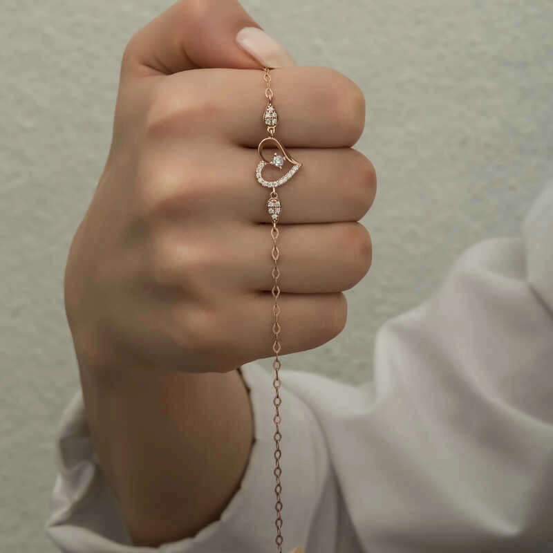 Aşkın ve sevginin bütün saflığıyla kucak açtığı en yüce tasarımdır kalp... Bu şık kalp deseniyle sevdiklerinizi mutlu etmeye ne dersiniz? Aşk dolu bu bilekliği sevgilinize doğum günü , sevgililer günü yada özel günlerde hediye ederek onları mutlu edebilirsiniz... Bu kalpli bileklik 925 ayar gümüşten imal edilmiştir. Gümüş üzerine rose kaplama yapılmıştır. Rose kaplama yapılan gümüş kadın bileklik modelleri parlaklığını uzun süre muhafaza eder ve oksitlenmeyi geciktirir. Üzerinde bulunan taşlar zirkondur. Tüm gümüş kadın bileklik modellerinde olduğu gibi gümüş kalpli kadın bileklik de el emeği ile üretilmiştir. Gümüş ve değerli taşlar nedeniyle belirtilen ürün ağırlığında ± %10 sapma olabilmektedir.