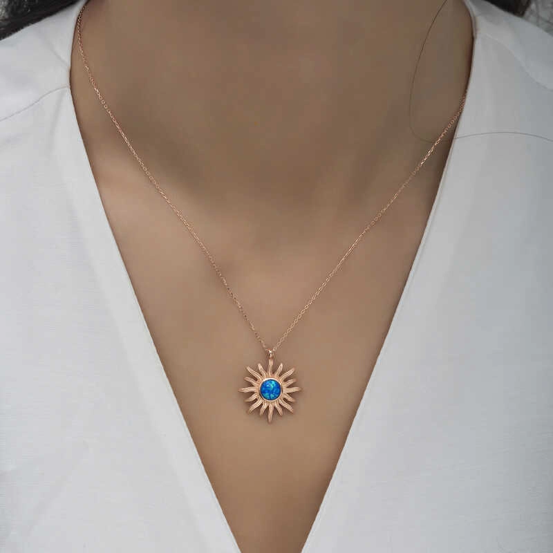 925 Ayar Gümüş Rose Mavi Opal Taşlı Güneş Kadın Kolye
