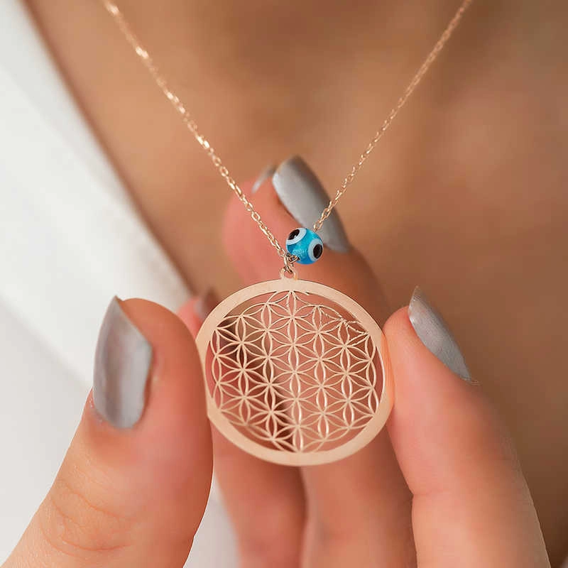 Yaşam çiçeği, iç içe geçmiş eşit alana sahip çok sayıda çember ve dışında büyük bir çemberden oluşan geometrik şekilden oluşmaktadır. Her bir çemberin merkezi, çevresindeki altı çemberin çevrelerinin kesiştiği yerdedir. Drunvalo Melchizedek bu sembolün evrenin ve yaşamın sırlarını barındırdığını iddia etmektedir. Günün her anında severek kullanabileceği hoş bir aksesuardır. Gümüş nazar gözlü yaşam çiçeği bayan kolye 925 ayar gümüşten imal edilmiştir. Bu kolye üzerine rose altın kaplama yapılmıştır. Rose altın kaplama yapılan ürünler parlaklığını uzun süre muhafaza eder ve gümüşü bakır rengine dönüştürür. Tüm gümüş bayan kolye modellerinde olduğu gibi gümüş nazar gözlü yaşam çiçeği bayan kolye modeli de el emeği ile üretilmiştir. Gümüş ve değerli taşlar nedeniyle belirtilen ortalama ürün ağırlığında ± %10 sapma olabilmektedir. Ürünlerimizin tamamı el emeği ile üretilmiştir.