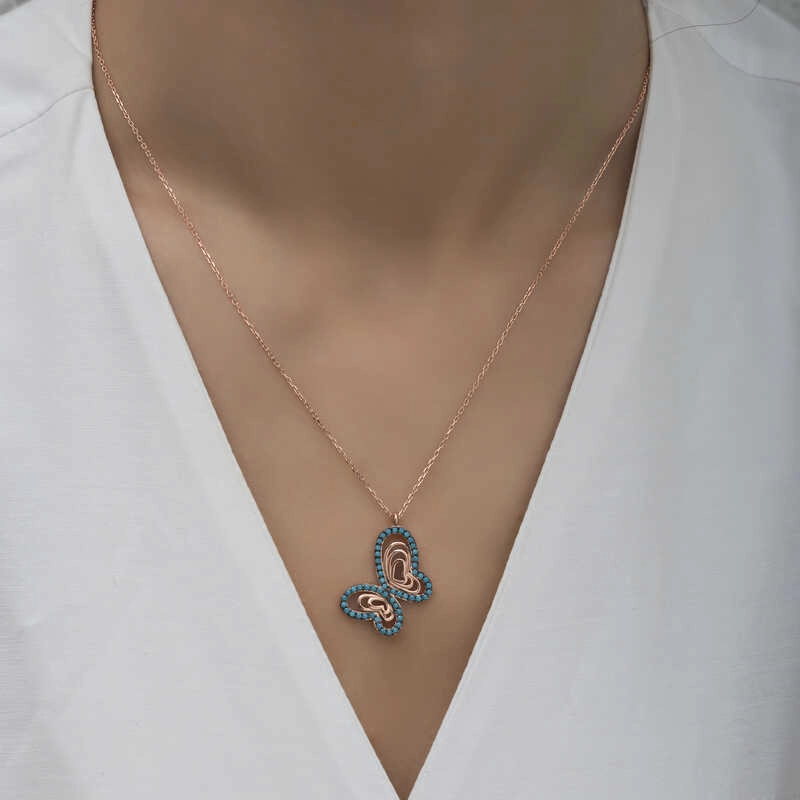 925 Ayar Gümüş Turkuaz Taşlı Kelebek Kadın Gümüş Kolye