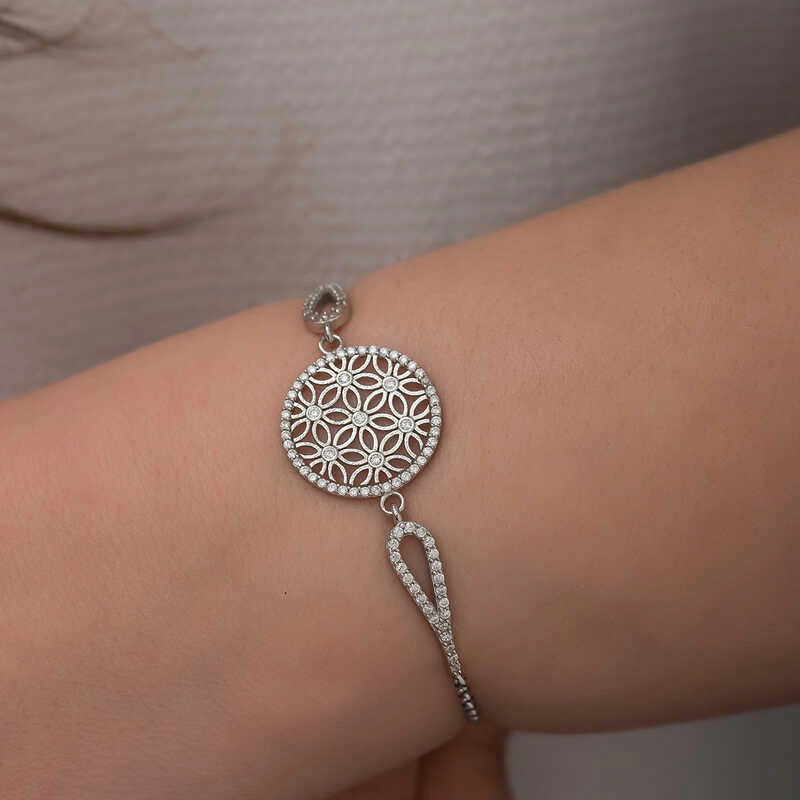 Yaşam çiçeği insan ve tüm canlıların yaradılışını geometrik bir şekilde anlatır. Sahip olduğu simgeler ile tek bir yaratıcının varlığına atıf yapar. Gerçekten de insanın ve tüm canlıların yaradılış düzeni yaşam çiçeğinin geometrik şekillerinde gizlidir. Dünyada “sessizliğin dili” ve “ışığın dili” olarak da bilinen yaşam çiçeğinin odak noktası, saf şeklinde ve orantısındadır. Yaşam çiçeği iç içe geçen 20 adet çemberden oluşmaktadır ve bu çemberler tüm evrenin sırrını içerisinde saklamaktadır. Yaşam çiçeğinin içerisinde bulunan ilk 7 çember dünyanın 7 günde oluştuğunu simgelemektedir. Yaşam çiçeği kutsal geometrik şekiller ile bağdaştırılmaktadır ve semavi dinlerin hemen hemen hepsinde yaşam çiçeği kullanılmıştır. Yaşam çiçeği sembollü aksesuarlar kişilerin daha enerjik bir ruh haline sahip olmasını ve ruhun temizlenmesini sağlamaktadır. Her dönem sevilen bu modeli; doğum günü hediyesi, sevgililer günü hediyesi veya annelere hediye olarak özel günlerde tercih edebilirsiniz. Gümüş yaşam çiçeği bileklik, 925 ayar gümüşten imal edilmiştir. Gümüş üzerine rodyum kaplama yapılmıştır. Rodyum kaplama yapılan gümüş bayan bileklikler parlaklığını uzun süre muhafaza eder, oksitlenmesi gecikir. Üzerinde bulunan taşlar zirkondur. Tüm gümüş bayan bilekliklerinde olduğu gibi bu gümüş bayan bileklik modeli de tamamı el emeği ile üretilmiştir. Gümüş ve değerli taşlar nedeniyle belirtilen ortalama ürün ağırlığında ± %10 sapma olabilmektedir.