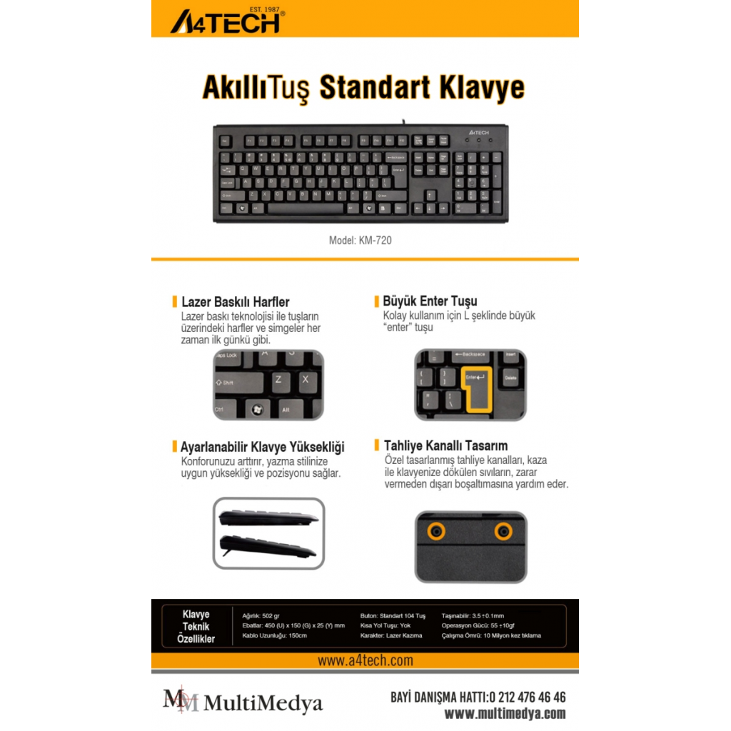 A4 TECH KM-720, Siyah, USB Kablolu, Turkce Q, Multimedya KLAVYE