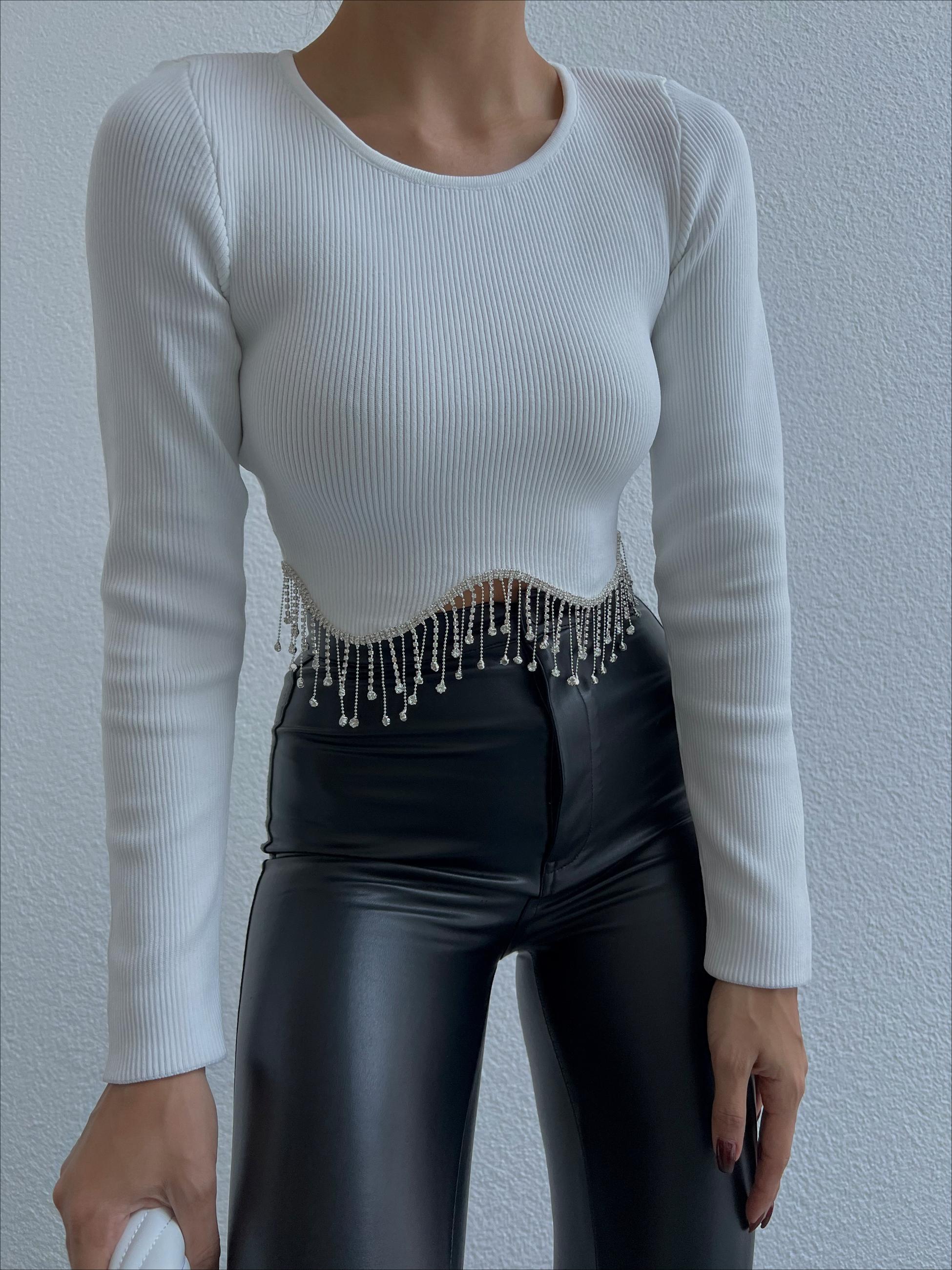 Asimetrik Taş Püskül Detaylı Crop Triko Bluz