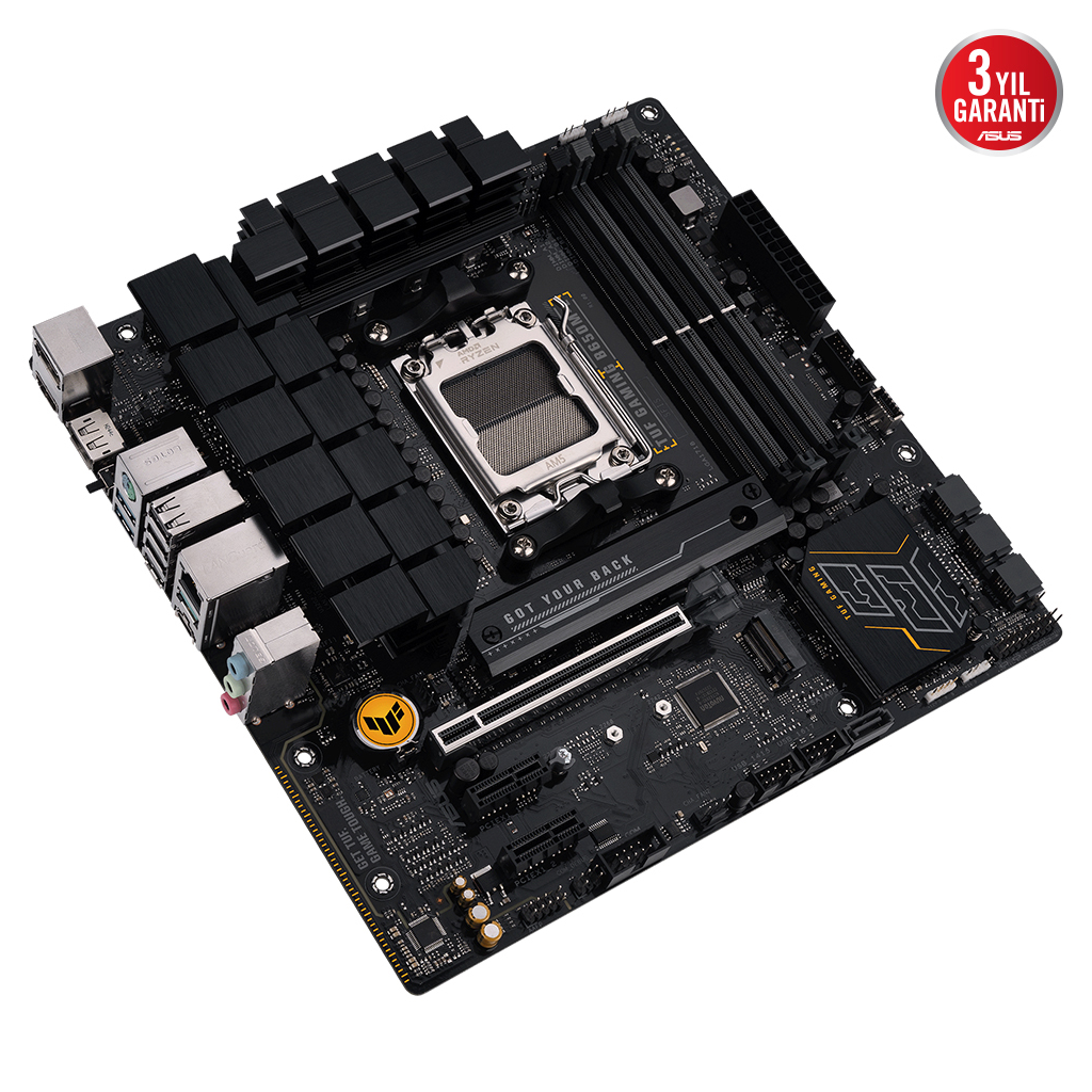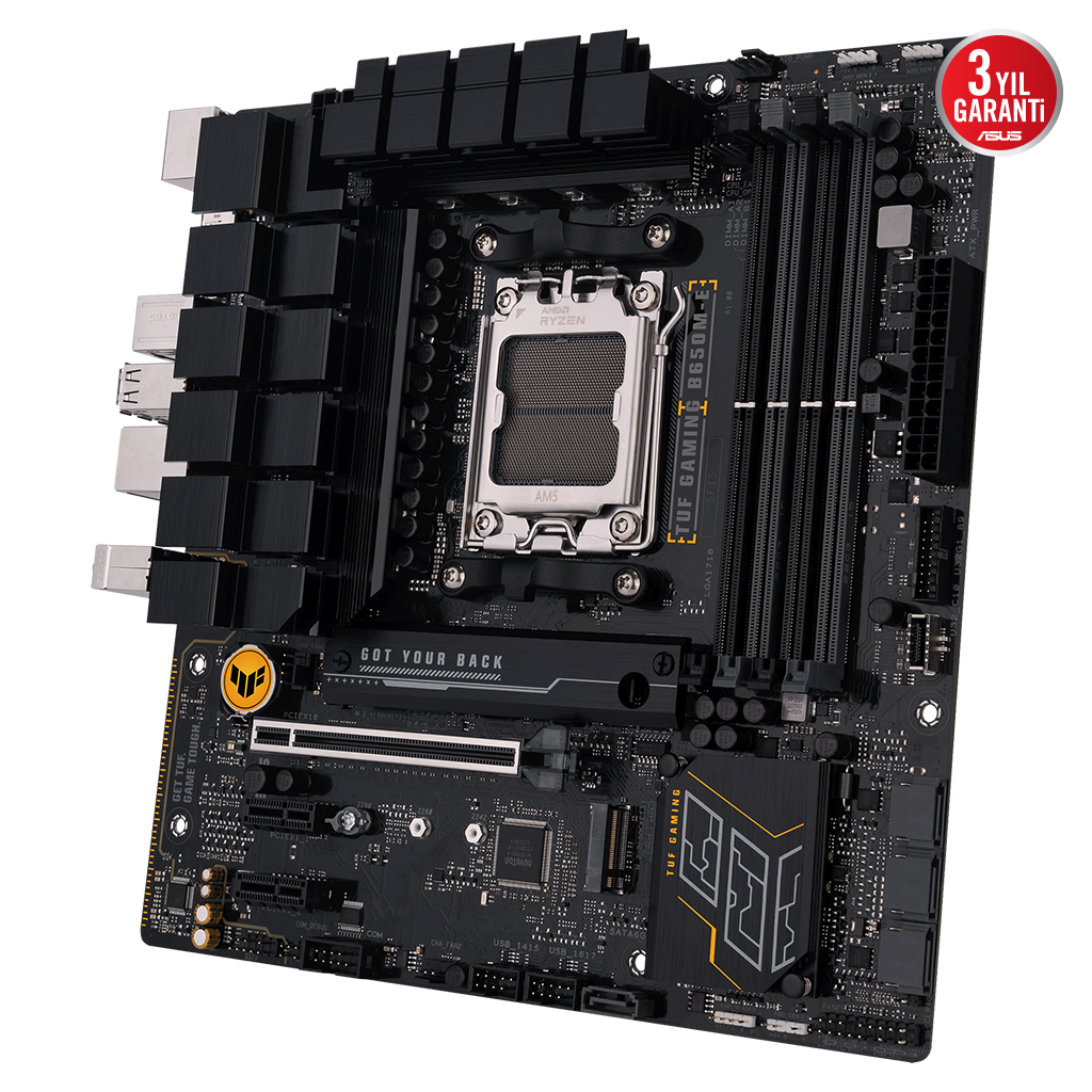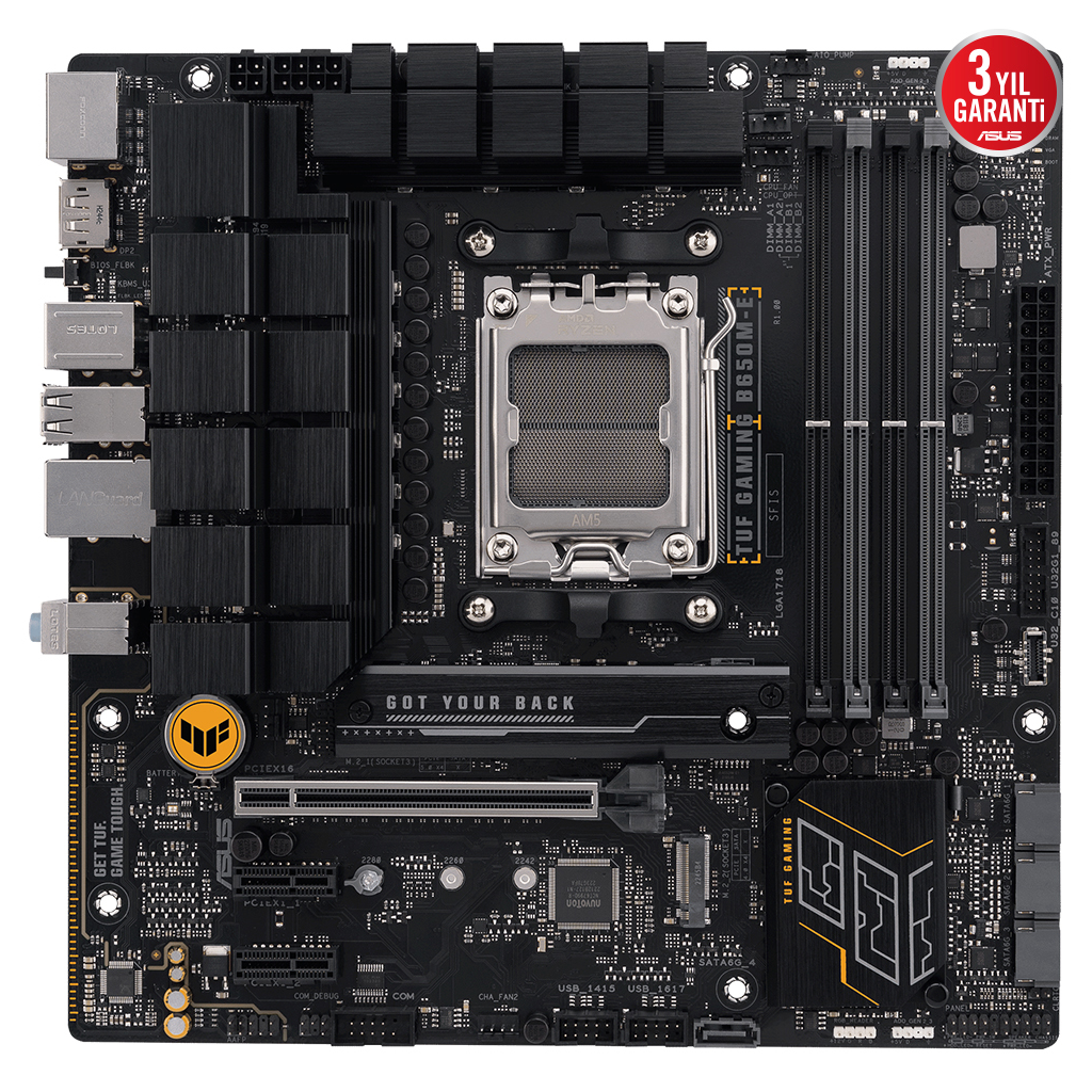 ASUS TUF GAMING B650M-E, en yeni AMD Ryzen 7000 serisi islemcilerin en önemli unsurlarini oyunlara yönelik özellikler ve kanitlanmis dayaniklilikla bir araya getiriyor. Askeri sinif bilesenler, gelismis güç çözümü ve kapsamli sogutma sistemiyle donatilan bu anakart, oyun maratonlari için kararli ve saglam performans ile beklentilerin ötesine geçiyor. TUF GAMING anakartlar, digerlerinin basarisiz olabilecegi kosullarla basa çikabileceklerini garantilemek için zorlu testlerden geçiriliyor. Bu model estetik bakimdan, TUF GAMING serisini tanimlayan güvenilirligi ve kararliligi yansitmak için saglam siyah rengi ve geometrik tasarim ögelerini bir araya getiriyor.