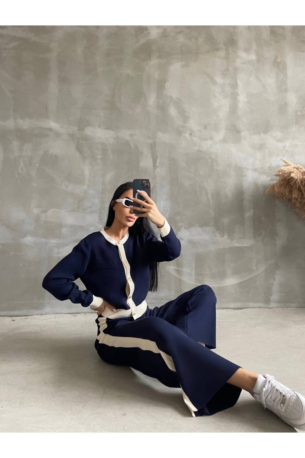 Bisiklet Yaka Cepli Gold Düğme Hırka Pantolonu Şeritli Alt-üst Triko Takım