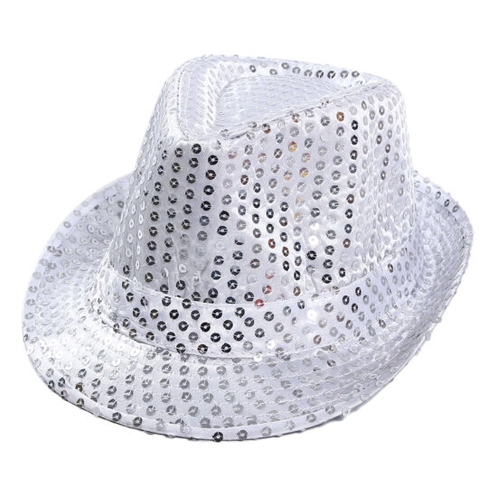 Bu şapka, ister bir gösteride sahneye çıkın ister bir kostüm partisi için giyinin, göz alıcı bir görünüm oluşturmak için mükemmeldir. Yumuşak gümüş payetlerle kaplı şapka, ışıltılı bir etki oluştururuyor.
