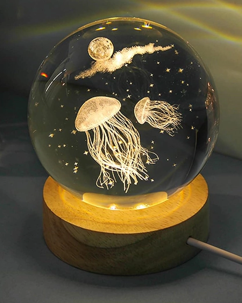 Dekoratif Deniz Anası Tasarımlı Ahşap altlıklı Işıklı Cam Küre Büyük Boy Cam:8cm Ahşap:2cm