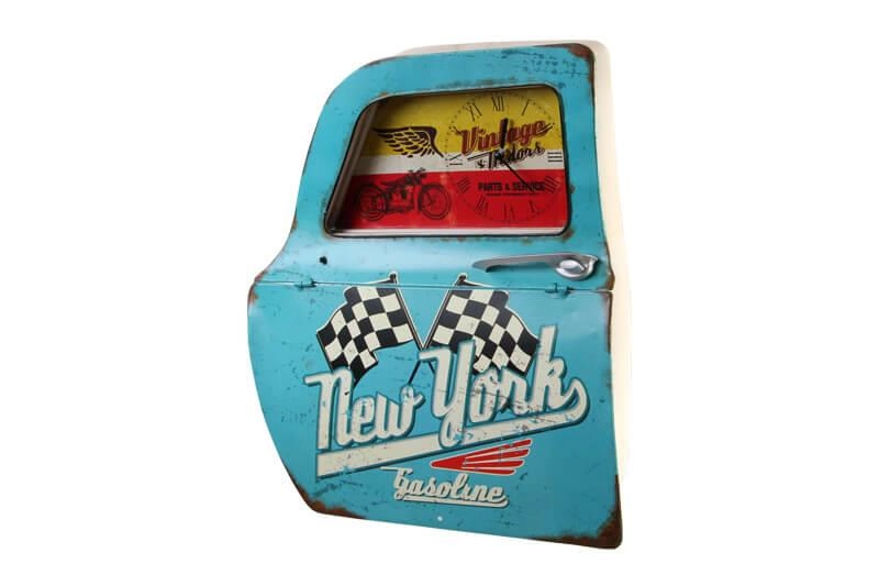 Dekoratif Newyork Temalı Mavi Araba Kapısı Saatli Duvar Rafı