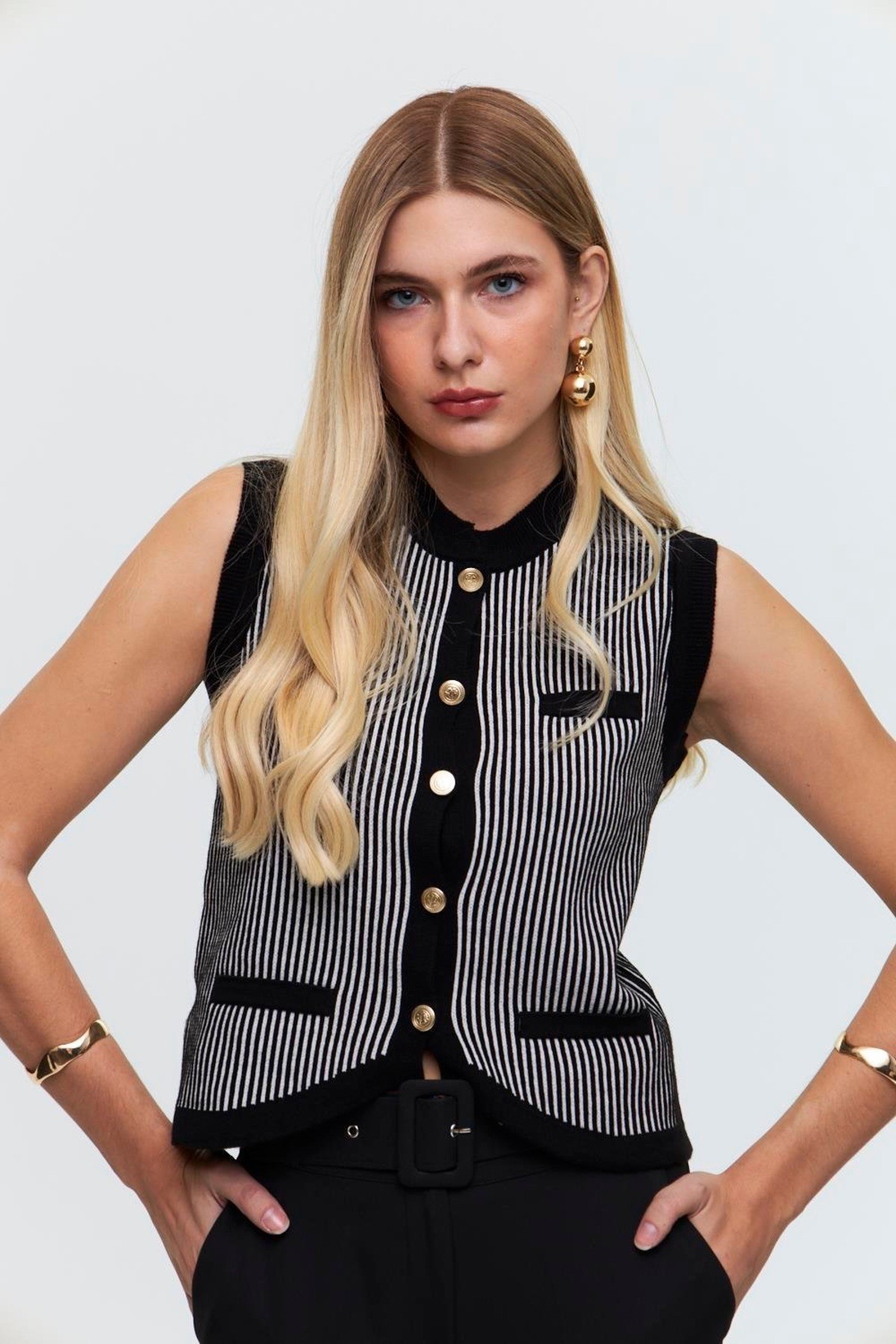 Dik Çizgili Cep Kapağı Detaylı Oval Kesim Triko Yelek