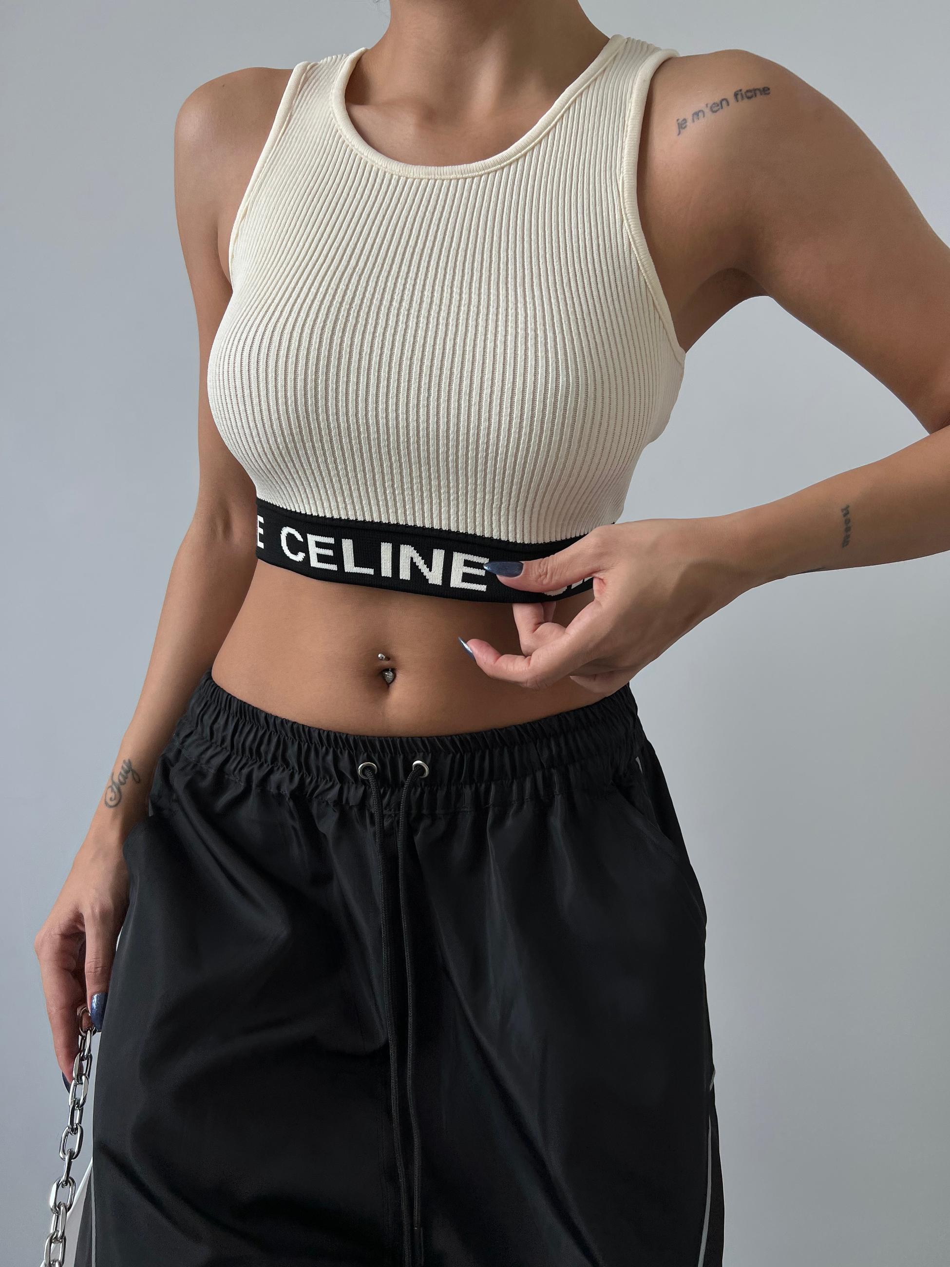 Düz Renk Bantı Yazılı Crop Triko Bluz