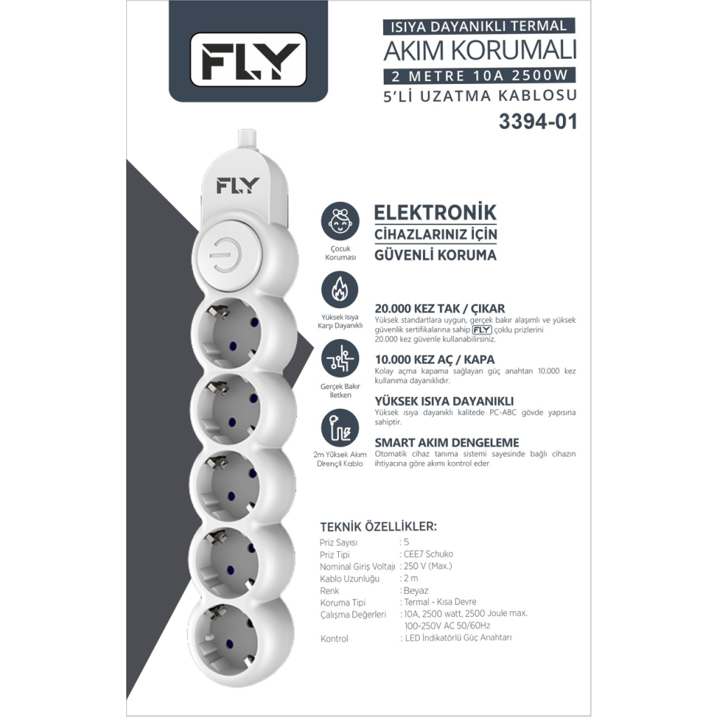 FLY FLY-3394-01 5'li Akim Korumali Priz,2m,10 A 2500W