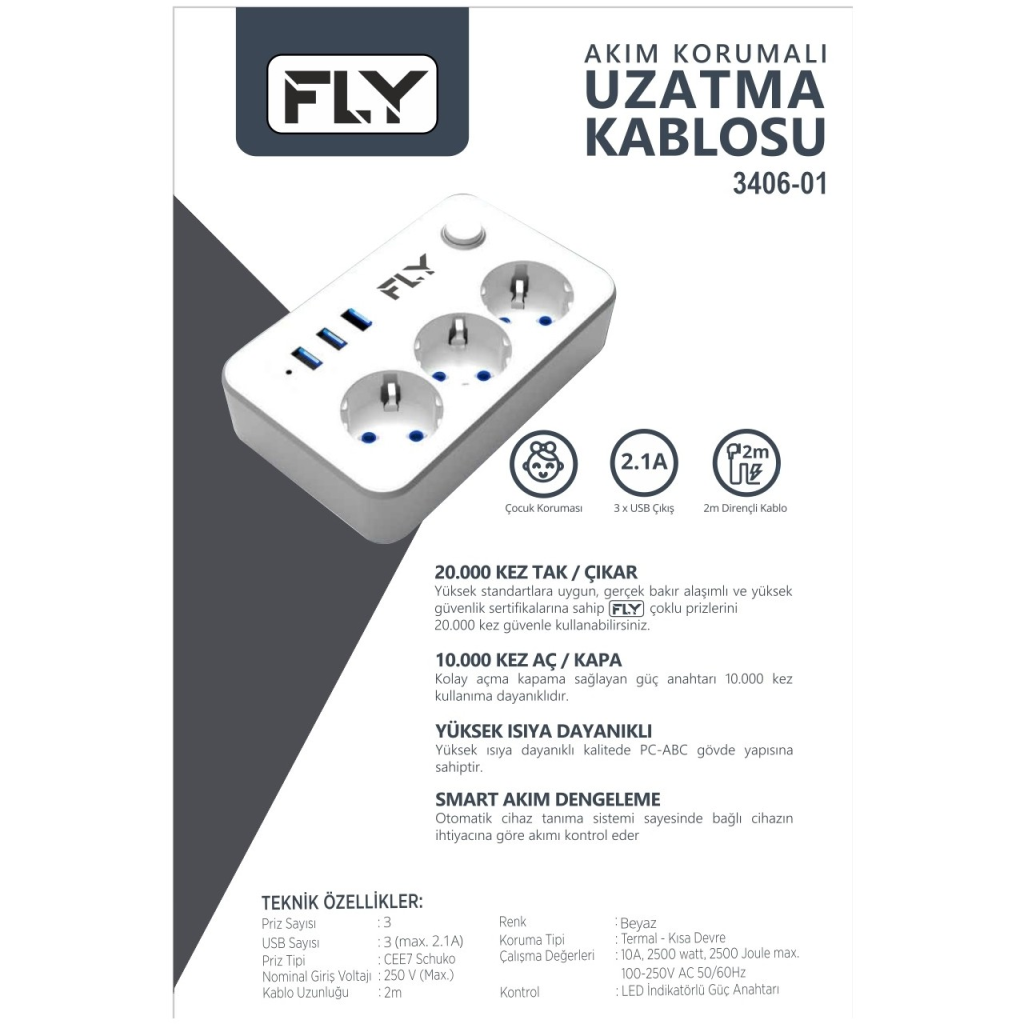 FLY-3406 Akim Korumali Anahtarli Toprakli Çocuk Korumali 3'lü Grup Priz (3'li USB Sarj Destekli) 2 Metre