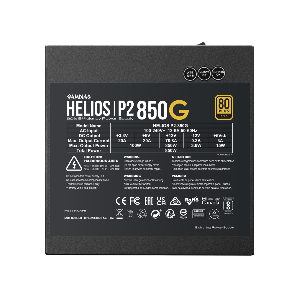 GAMDIAS HELIOS P2-850G, 850W, 80+ Gold, Full Moduler, Aktif PFC, GAMING, ATX, Power Supply (PSU)