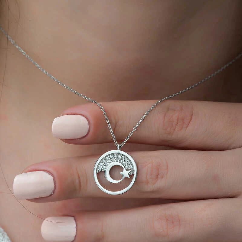 Türk Bayrağının rengini şehitlerin kanından, ilhamını da kan gölüne yansıyan ay ve yıldızdan aldığını biliyoruz. Bayrağın taşıdığı kutsal anlamı teninizde taşımak ve sevdiklerinizle paylaşmak için kaçırılmayacak bir fırsat. Ay yıldız kolye 925 ayar gümüşten imal edilmiştir. Gümüş üzerine rodyum kaplama yapılmıştır. Rodyum kaplama yapılan kolye modelleri parlaklığını uzun süre muhafaza eder ve oksitlenmesi gecikir. Tüm kolye modellerinde olduğu gibi ay yıldız bayan kolye de el emeği ile üretilmiştir. Üzerindeki taşlar zirkondur. Gümüş ve değerli taşlar nedeniyle belirtilen ortalama ürün ağırlığında ± %10 sapma olabilmektedir.