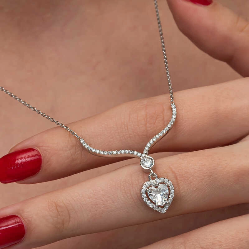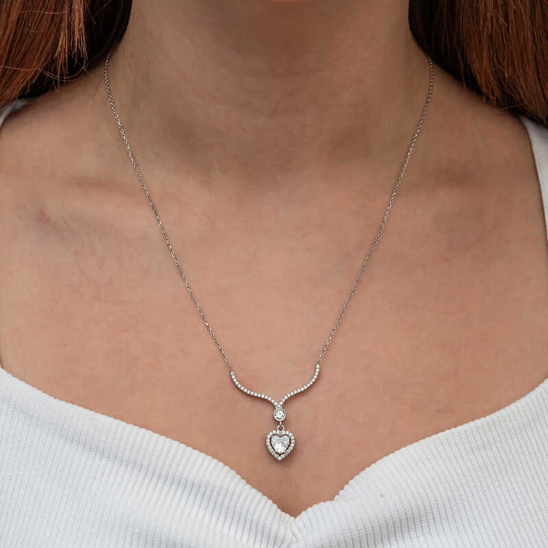 Gümüş Beyaz Zirkon Taşlı Kalp Kadın Kolye