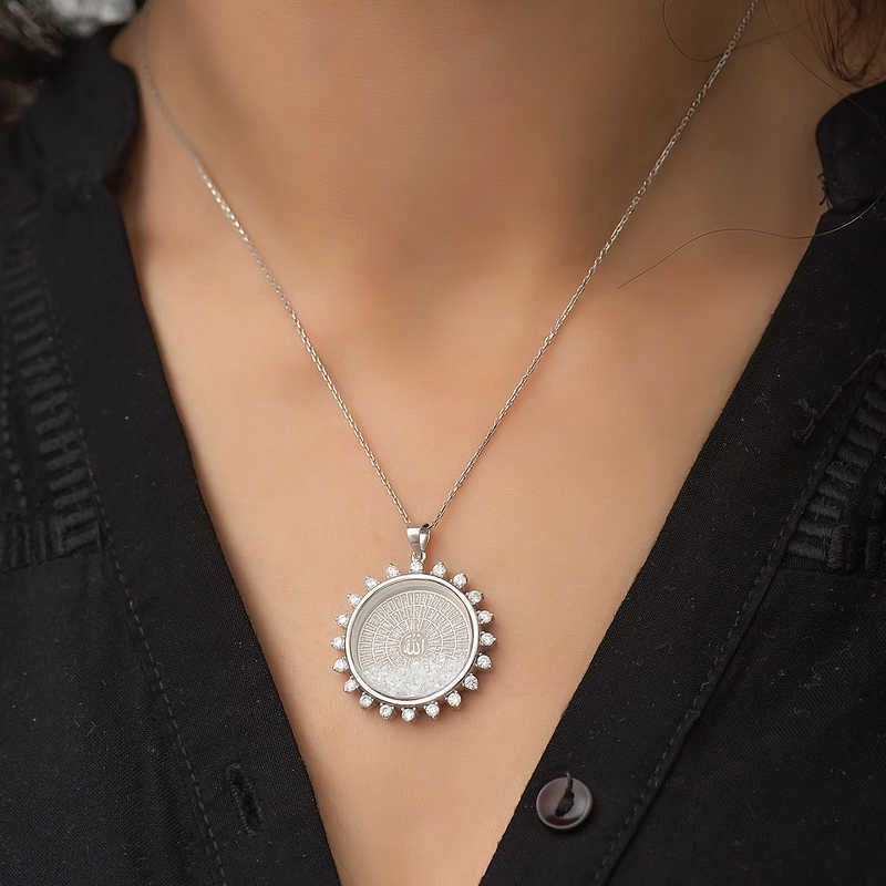 Esmaül Hüsna, en güzel isimler anlamına gelen Allah’ın doksan dokuz ismine verilen addır. Esmaül Hüsna’nın yazılı olduğu, içinde zirkon taşların yer aldığı bu harika kolye 925 ayar gümüşten imal edilmiştir. Gümüş üzerine rodyum kaplama yapılmıştır. Rodyum kaplama yapılmış gümüş kolye modelleri parlaklığını uzun süre muhafaza eder. Kolye ile birlikte gelecek olan zincir de gümüştür ve uzunluğu 45 cm’dir. Bu özel tasarım kolye; doğum günü hediyesi, sevgililer günü hediyesi veya annelere hediye olarak özel günlerde tercih edilebilecek mükemmel bir seçenektir. Tüm gümüş kolye modellerimizde olduğu gibi gümüş Esmaül Hüsna kolye modeli de el emeği ile üretilmiştir. Gümüş ve değerli taşlar nedeniyle belirtilen ürün ağırlığında ± %10 sapma olabilmektedir.
