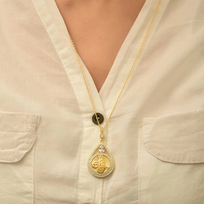 Osmanlı Devleti ve İmparatorluğu'ndaki padişahların imza olarak da kullandığı tuğra sembolü damla kolye ile birleşerek hem anlamı, hem de kalbin yarısı anlamına gelen damla şekli ile aşkı anlatan bir kolye haline gelmiştir. Böylelikle sevdiklerinizi veya kendinizi dini ve derin bir anlama sahip olan bu gümüş kolye ile sevindirebilirsiniz. 925 ayar gümüşten imal edilmiştir. Gümüş üzerine gold kaplama yapılmıştır. Gold kaplama yapılan gümüş kadın kolye modelleri parlaklığını uzun süre muhafaza eder, gümüşe altın rengini verir. Üzerinde bulunan taşlar zirkondur. Zincir boyu ortalama 70 cm'dir. Ürünlerimizin tamamı el emeği ile üretilmiştir. Gümüş ve değerli taşlar nedeniyle belirtilen ortalama ürün ağırlığında ± %10 sapma olabilmektedir.