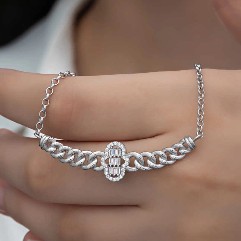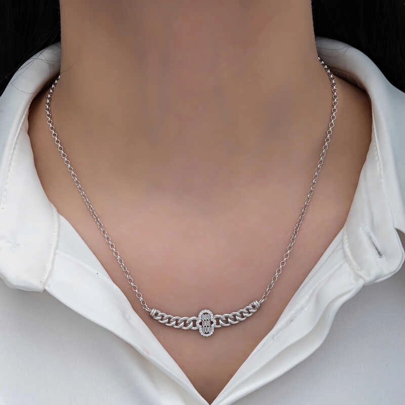 Modası hiçbir zaman geçmeyecek olan yuvarlak baget taşlı kadın kolye, günümüz takıları ile farklı stillerde yeniden yorumlanıyor. Zirkonun göz alıcı ışıltısı, sizi de saracak. Sizin olduğu kadar sevdiklerinizin de keyifle takacağı bu gümüş beyaz baget taşlı kadın kolye, aynı zamanda sevginizi paylaşabileceğiniz en güzel hediyelerden biri olacaktır. Ürün 925 ayar gümüşten imal edilmiştir. Gümüş üzerine rodyum kaplama yapılmıştır. Rodyum kaplama yapılan ürünler parlaklığını uzun süre muhafaza eder, oksitlenmesi gecikir. Zincir boyu ortalama 45 cm'dir. Üzerinde bulunan taşlar zirkondur ve bagettir. Gümüş kolyelerin tamamında olduğu gibi gümüş gurmet zincirli fatma ana eli baget taşlı kadın kolye de el emeği ile üretilmiştir. Gümüş ve değerli taşlar nedeniyle belirtilen ortalama ürün ağırlığında ± %10 sapma olabilmektedir.