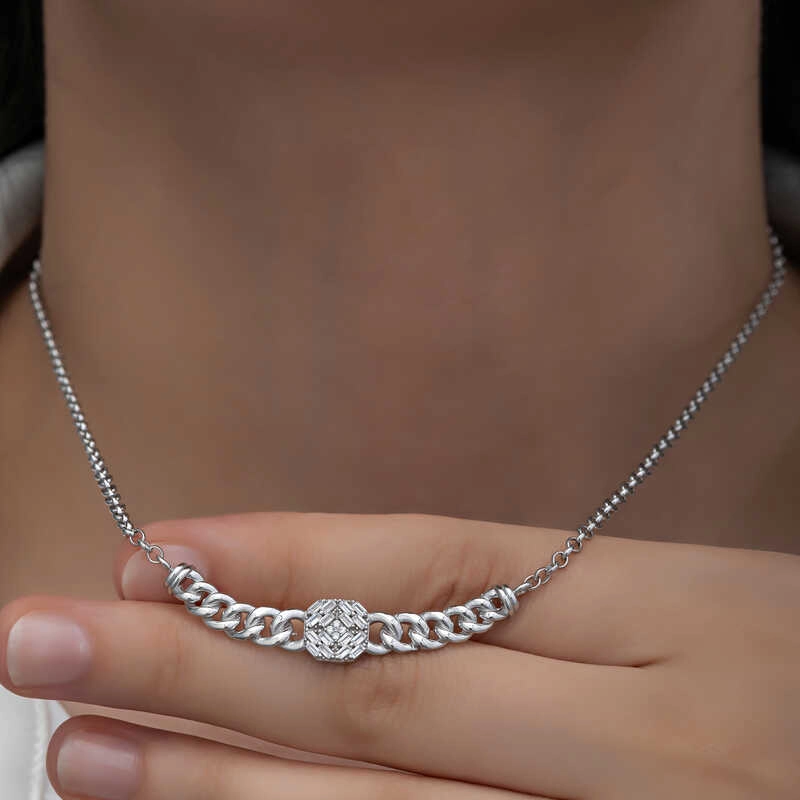 Gümüş Gurmet Zincirli Kare Baget Taşlı Kadın Kolye