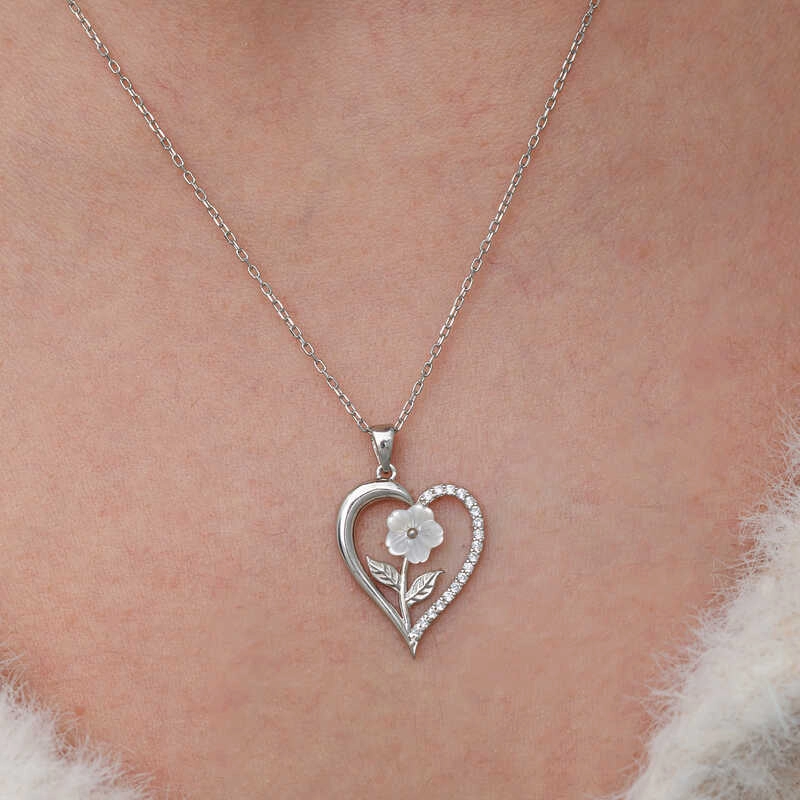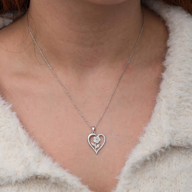 Gümüş Kalpli Beyaz Gül Kadın Kolye