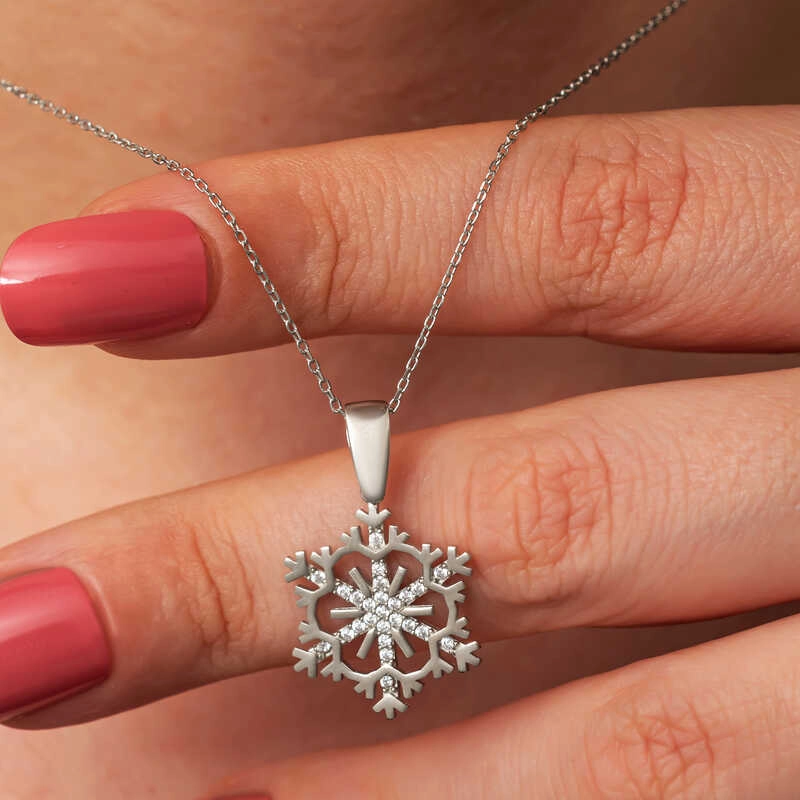 Kadınların ışıltısı, berraklığı kar tanesine benzetilip özel olarak tasarlanmıştır. Kar tanelerinin her birinin kadınlar gibi eşsiz ve ayrı kıymette olması onları özel kılan bir diğer özelliktir. Asilliği her dönemde dikkat çekmeyi başarmıştır. Bunun yanında insanların tıpkı kar taneleri gibi birbirlerine zarar vermeden de mutlu bir şekilde yaşayabileceklerini sembolize etmektedir. Bu şık kolye; doğum günü hediyesi, sevgililer günü hediyesi veya annelere hediye olarak özel günlerde tercih edilebilecek mükemmel bir seçenektir. Kolye, 925 ayar gümüşten imal edilmiştir. Gümüş üzerine rodyum kaplama yapılmıştır. Rodyum kaplama yapılan gümüş kadın kolye modelleri parlaklığını uzun süre muhafaza eder, oksitlenmesi gecikir. Zincir boyu ortalama 45 cm'dir. Tüm gümüş kadın kolye modellerinde olduğu gibi bu gümüş kar tanesi kadın kolye de tamamı el emeği ile üretilmiştir. Gümüş ve değerli taşlar nedeniyle belirtilen ortalama ürün ağırlığında ± %10 sapma olabilmektedir.