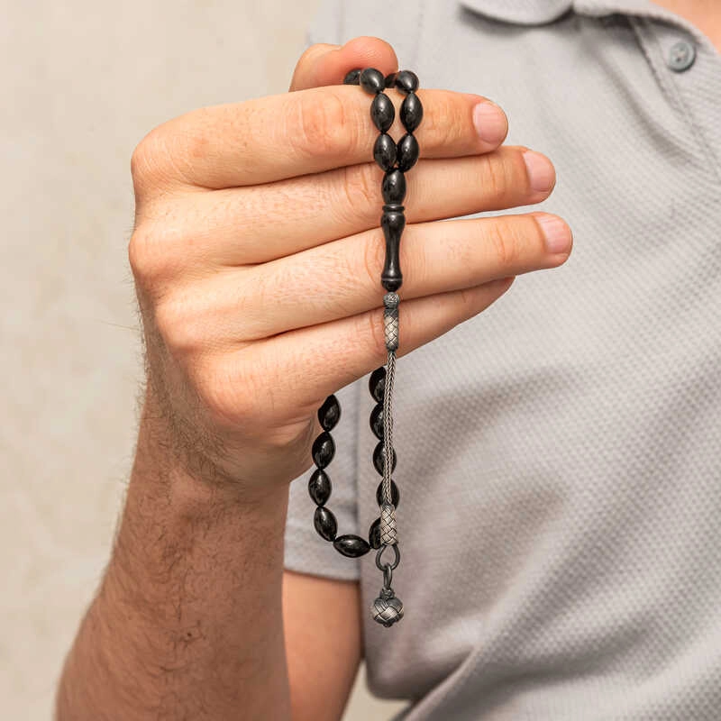 Gümüş Kazaz Püsküllü Siyah Sıkma Kehribar Tesbih