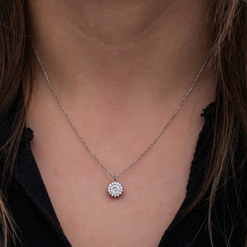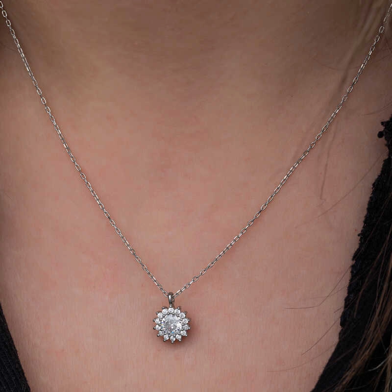 Gümüş üzerindeki zirkon taşlı taştan oluşan bu kadın kolye modeli günün her anında kullanabileceğiniz şık bir aksesuardır. Bu kolyeyi; kendinize ya da sevdiklerinize doğum gününde, Anneler gününde ya da özel günlerde hediye edebilirsiniz. Minimal yuvarlak anturaj kadın kolye modeli 925 ayar gümüşten imal edilmiştir. Gümüş üzerine rodyum kaplama yapılmıştır. Rodyum kaplama yapılan gümüş kadın kolye modelleri parlaklığını uzun süre muhafaza eder. Tüm kadın kolyelerde olduğu gibi gümüş yuvarlak anturaj kadın kolye modeli de el emeği ile üretilmiştir. Gümüş ve değerli taşlar nedeniyle belirtilen ortalama ürün ağırlığında ± %10 sapma olabilmektedir.