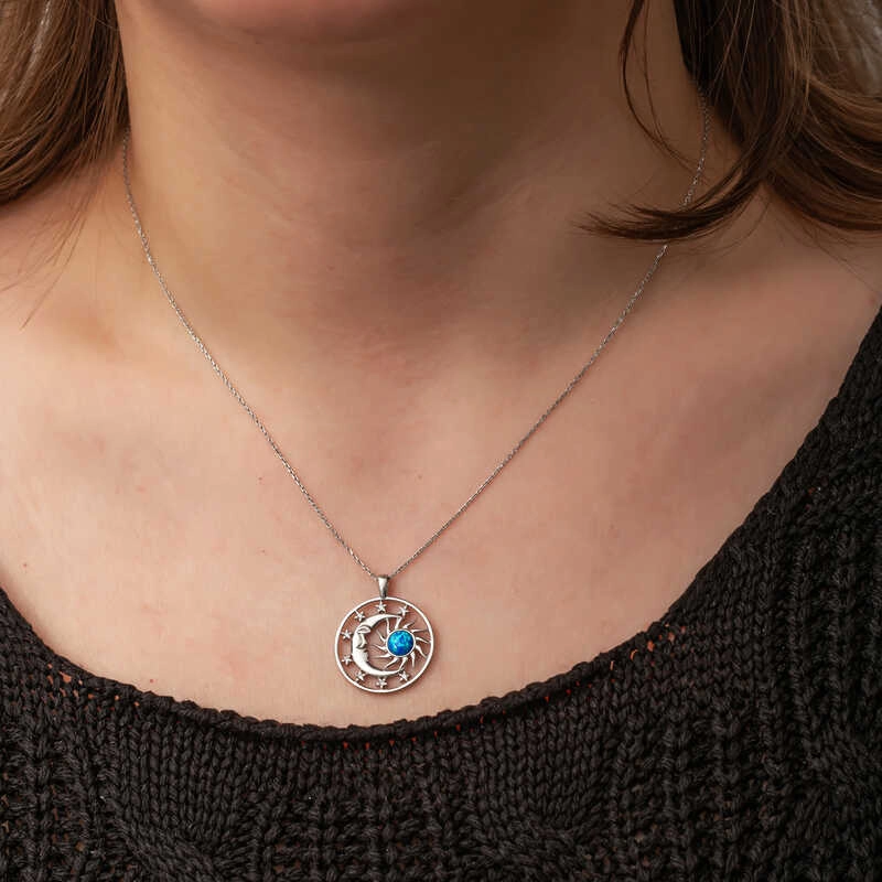 Gümüş Opal Mavi Taşlı Ay Güneş Kadın Kolye