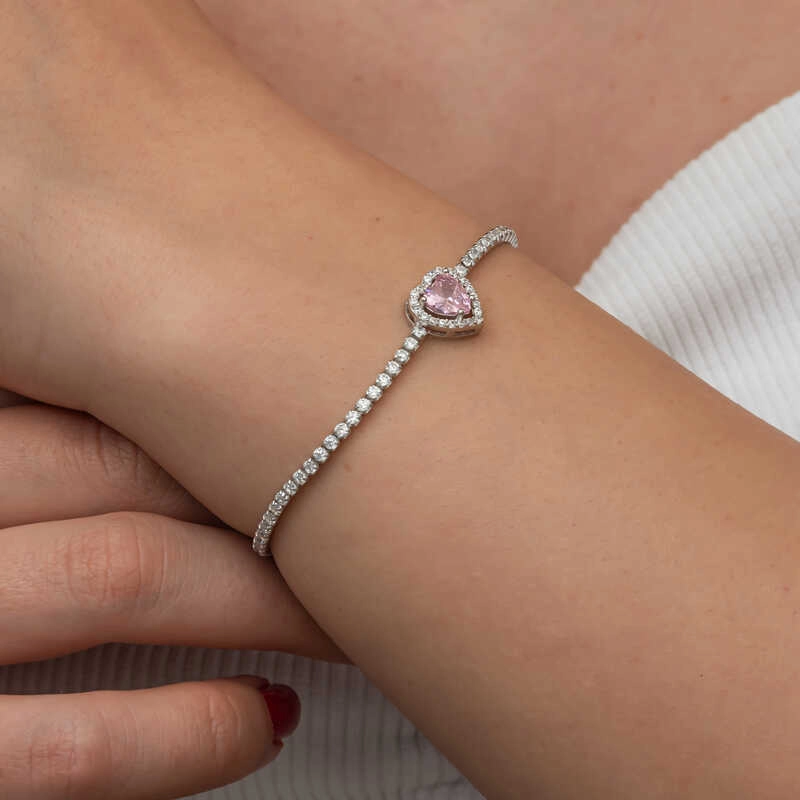 Gümüş Pembe Taşlı Kalpli Su Yolu Bileklik