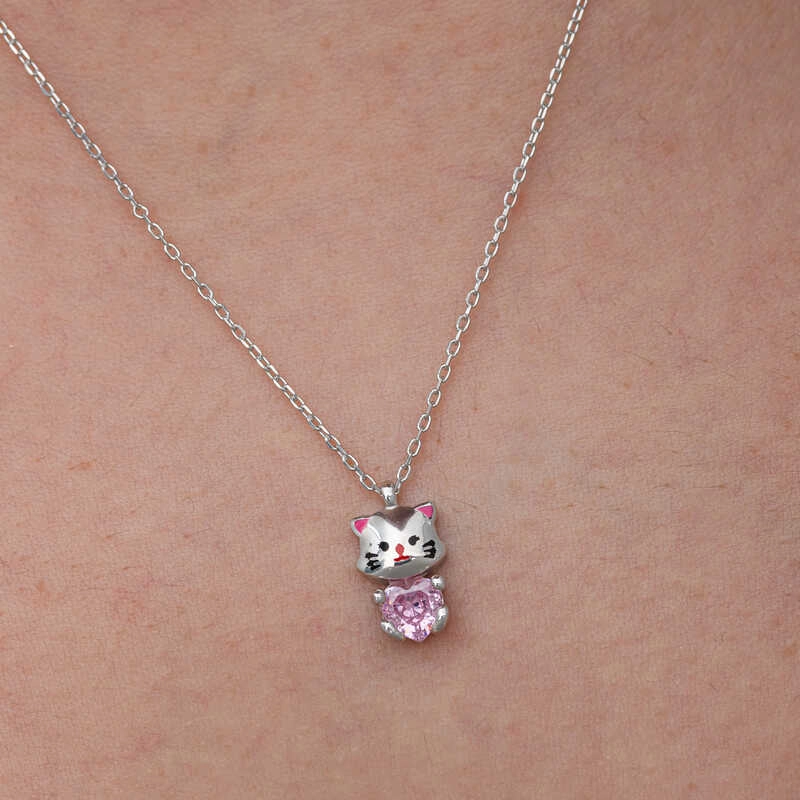 Gümüş Pembe Taşlı Sevimli Kedi Kadın Kolye