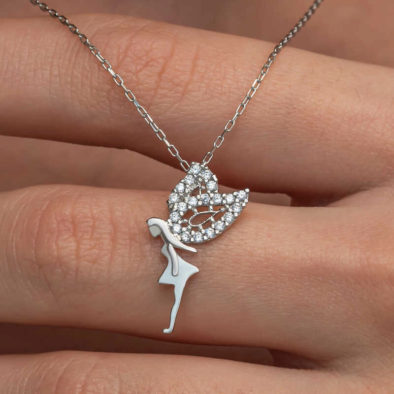 Hayal dünyasının sembolü olan peri kızı figürü ile tasarlanmış bu kolye, hem zarafeti hem de özgünlüğüyle her tarza uyum sağlar.Uçsuz bucaksız bir hayal dünyasının kapılarını aralamak için Peri kızı kadın kolyeyi sevdiklerinize hediye etmek için mükemmel bir seçenektir.Gümüş üzerine rodyum kaplama yapılmıştır.Rodyum kaplama yapılan kolyeler parlaklığını uzun süre muhafaza eder ve oksitlenmesi gecikir.Gümüş ve değerli taşlar nedeniyle belirtilen ortalama ürün ağırlığında ± %10 sapma olabilmektedir.