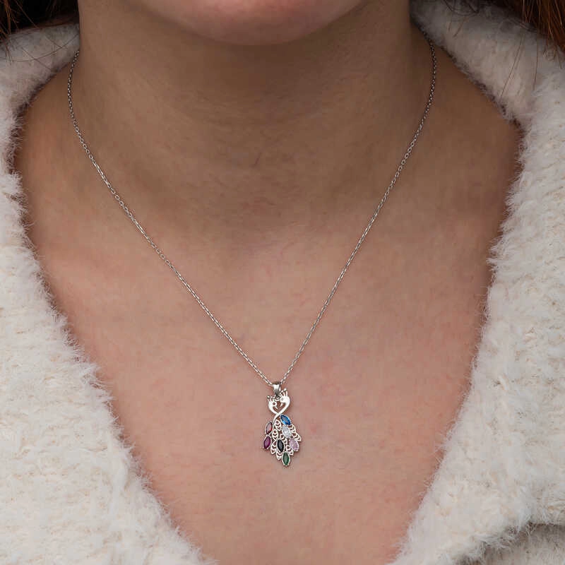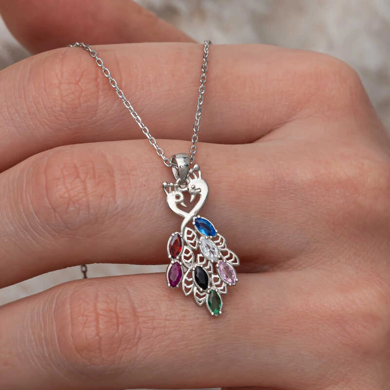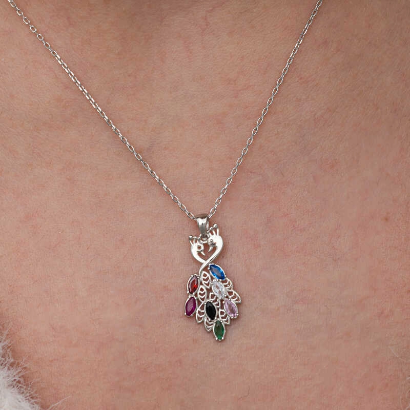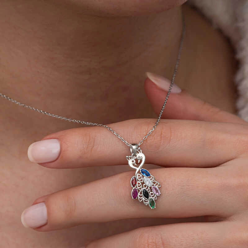 Tavus kuşu kolyesi, genellikle zarafet, güzellik ve özgürlüğü simgeler. Tavus kuşunun göz alıcı ve çok renkli tüyleri, yine özgüveni ve gururu temsil eder. Farklı kültürlerde tavus kuşları, farklı anlamlara bürünebilir; bazıları için bu kuş, iyi şans ve koruma anlamına gelirken, diğerlerinde yeniden doğuş ve yenilenmeyi simgeler.Bu şık kolye; doğum günü hediyesi, sevgililer günü veya özel günlerde tercih edilebilecek mükemmel bir seçenektir. Kolye; 925 ayar gümüşten imal edilmiştir. Gümüş üzerine rodyum kaplama yapılmıştır. Diğer kolyelerde olduğu gibi gümüş tavus kuşu kolye de el emeği ile üretilmiştir. Gümüş ve değerli taşlar nedeniyle belirtilen ortalama ürün ağırlığında ± %10 sapma olabilmektedir.
