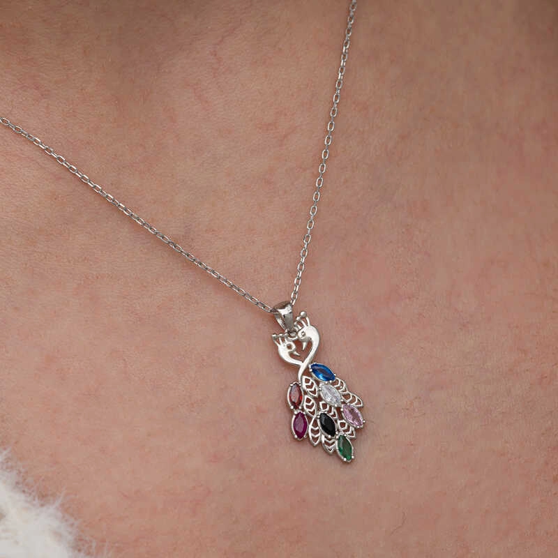 Gümüş Renkli Taşlı Tavus Kuşu Kadın Kolye