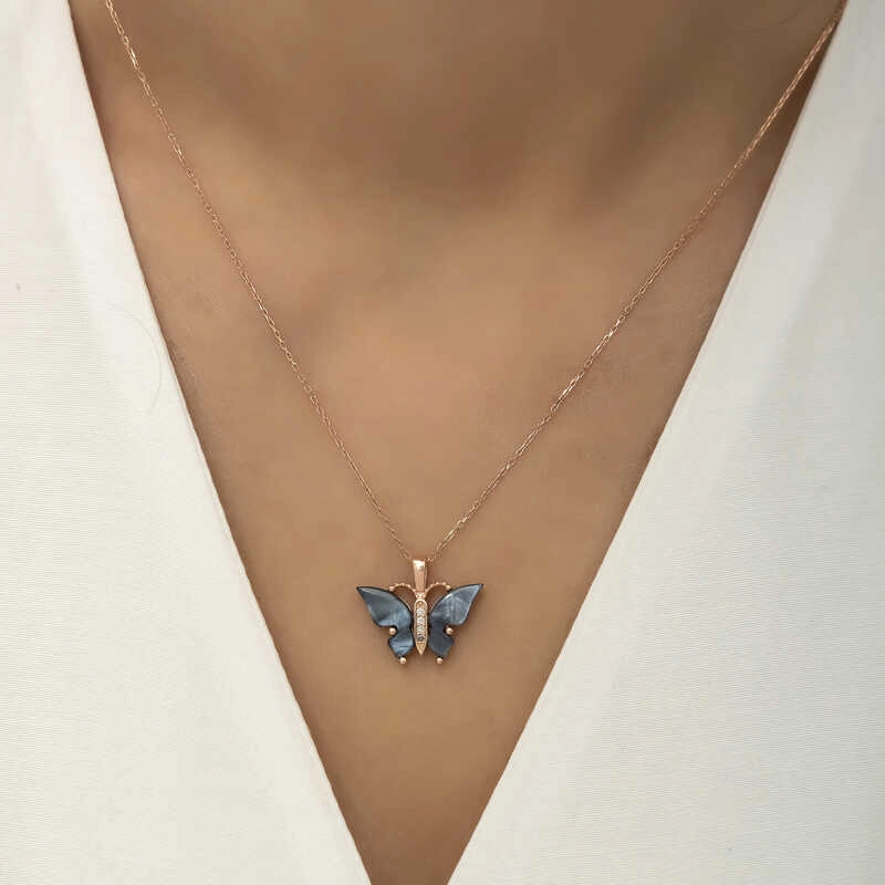 Gümüş Rose Antrasit Kaplangözü Taşlı Kelebek Bayan Kolye