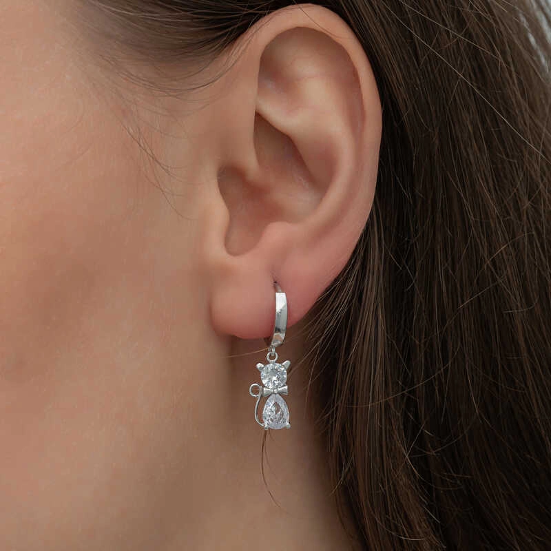 Gümüş Sallantılı Kedi Kadın Küpe