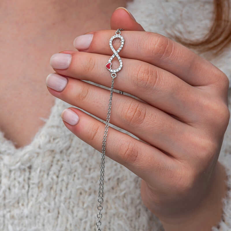 Sonsuza kadar sürecek aşkı anlatmanın en güzel yollarından biri de sevgiliye kalpli sonsuzluk sembollü gümüş takılar hediye etmektir.Sonsuzluk sembolü ebedi aşkın ve sadakatin işareti olarak evlilik yıl dönümü veya sevgililer günü gibi özel günlerde alınabilecek anlamlı hediyelerinden biri olabilecektir.Kalpli sonsuzluk bayan bileklik 925 ayar gümüşten imal edilmiştir.Gümüş üzerine rodyum kaplama yapılmıştır.Rodyum kaplama yapılan gümüş kadın bileklik modelleri parlaklığını uzun süre muhafaza eder ve oksitlenmesi gecikir.Bileklik üzerinde bulunan taşlar zirkondur.Tüm kadın gümüş bileklik modellerinde olduğu gibi gümüş kalpli sonsuzluk kadın bileklik de el emeği ile üretilmiştir. Gümüş ve değerli taşlar nedeniyle belirtilen ürün ağırlığında ± %10 sapma olabilmektedir.